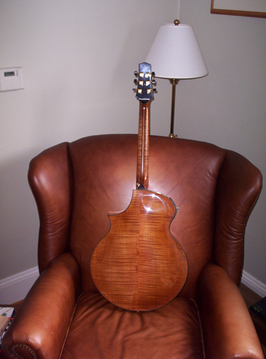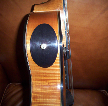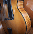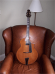 | This is my new ISI Oneida Jazz, built by Eric Aceto and his son, Jordan Aceto. This is a fantastic instrument! There are no "F" holes, just a port in the side that can be closed with an elegant cover to reduce feedback at louder volumes. It's still brand new (you can smell the varnish!), and it changes daily, so I'm sure there'll be various adjustments I'll want to make, but even fresh out of the box, it's a remarkable and innovative guitar. | ||||||||||